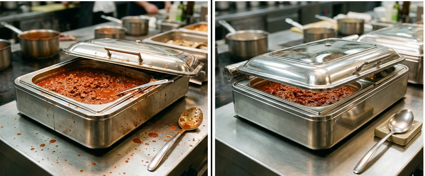 Решение: Выбирайте современные шеффинг-диши с окном из закаленного стекла. Это сохраняет сочность продуктов и снижает нагрузку на систему подогрева.