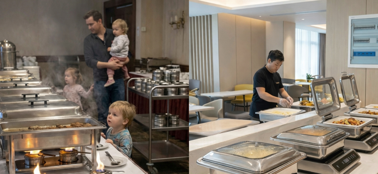 Классические шеффинг-диши на горелках постепенно уходят в прошлое. Открытый огонь повышает риск ожогов, особенно если среди гостей есть дети. Кроме того, такие решения могут вызвать вопросы у проверяющих органов. А также для отеля - это постоянные затраты на расходные материалы, неприятный запах горения.